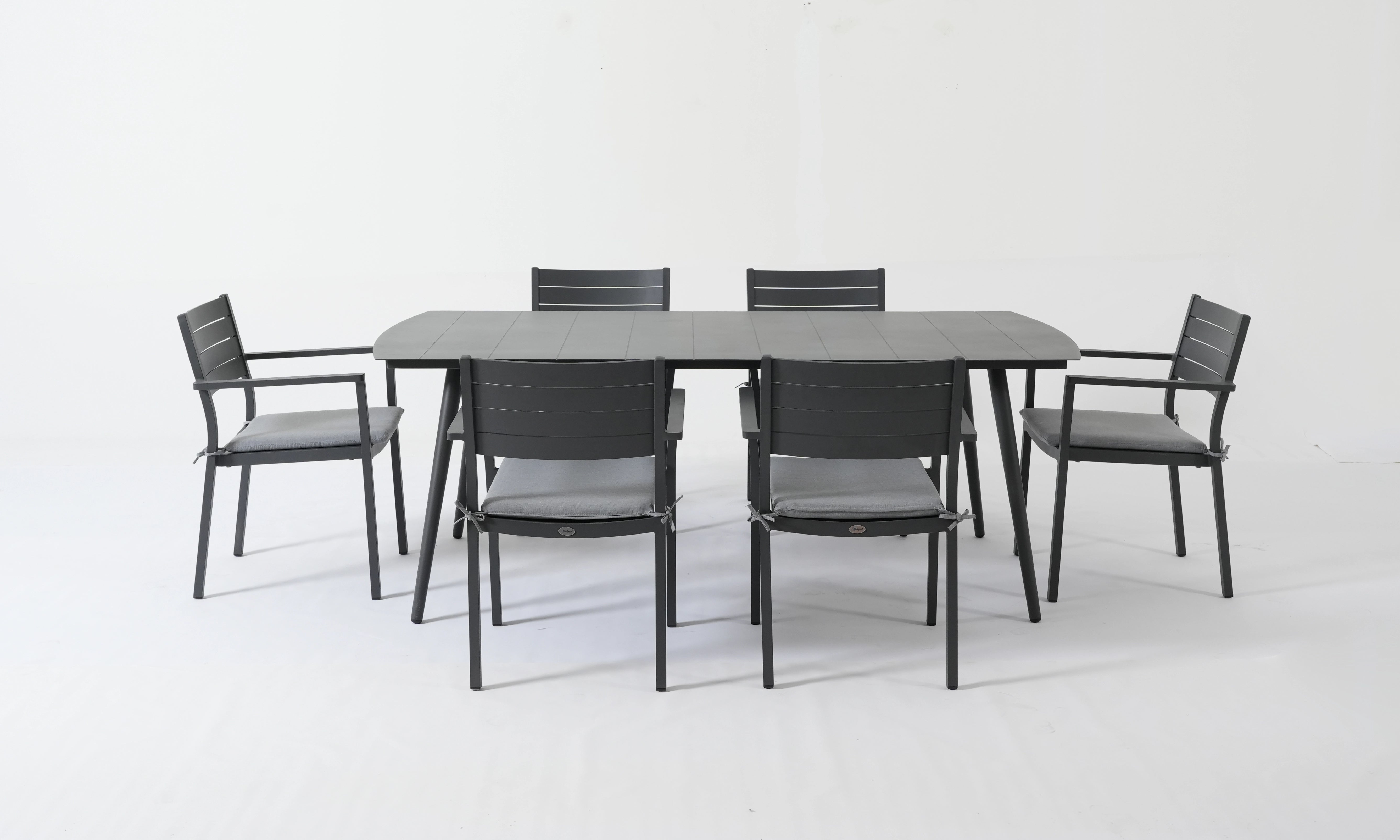 Elegant, durable, and distinctly modern – the Azzurro Dining Set is crafted entirely from high-quality powder-coated aluminum for lasting outdoor use.