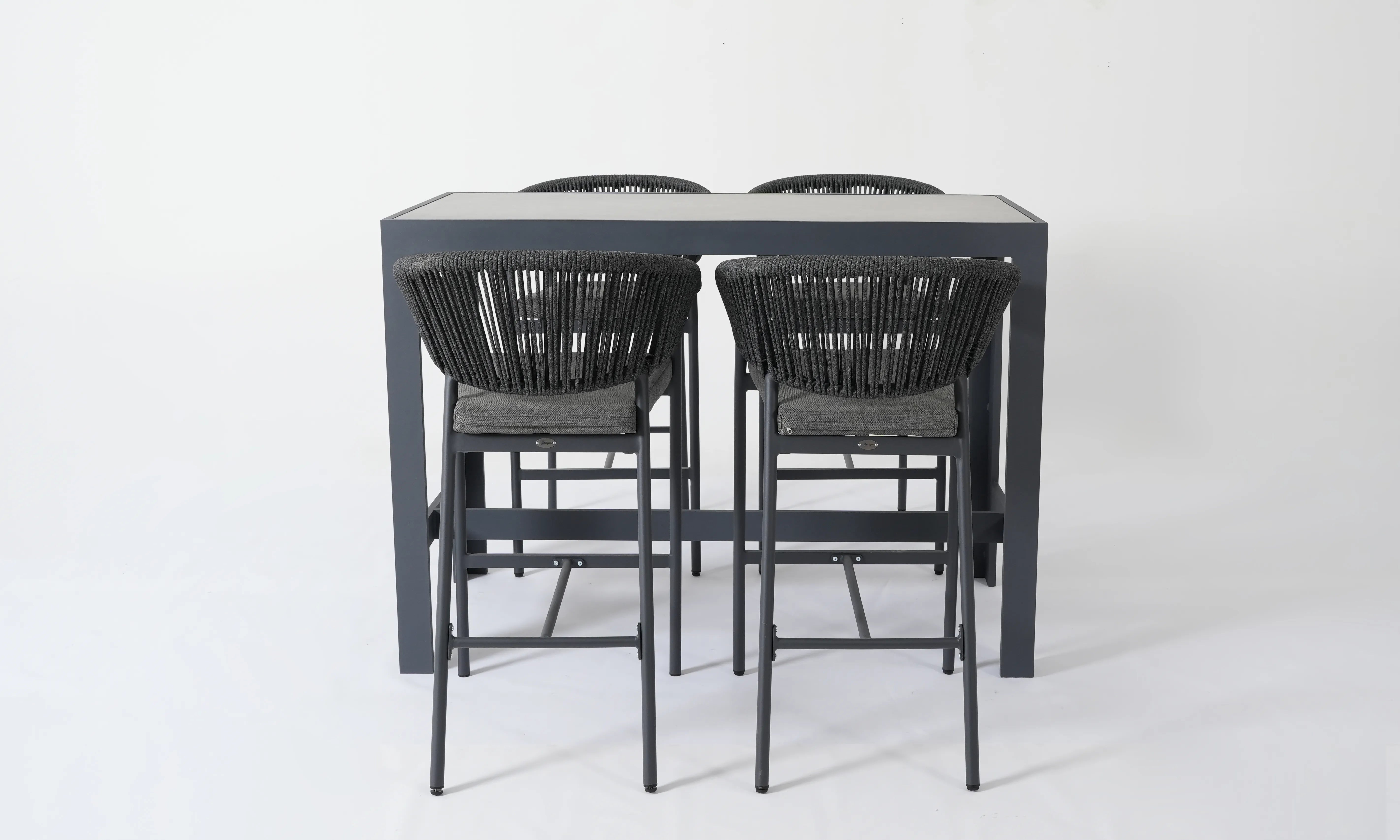 Bring refined style to your outdoor space with the Lorenzo Bar Table Set, featuring a sleek aluminum frame and hand-woven Olivine rope. This premium set includes a 150×75 cm porcelain-top bar table and four barstools crafted with waterproof fabric cushions for all-weather comfort.