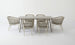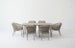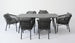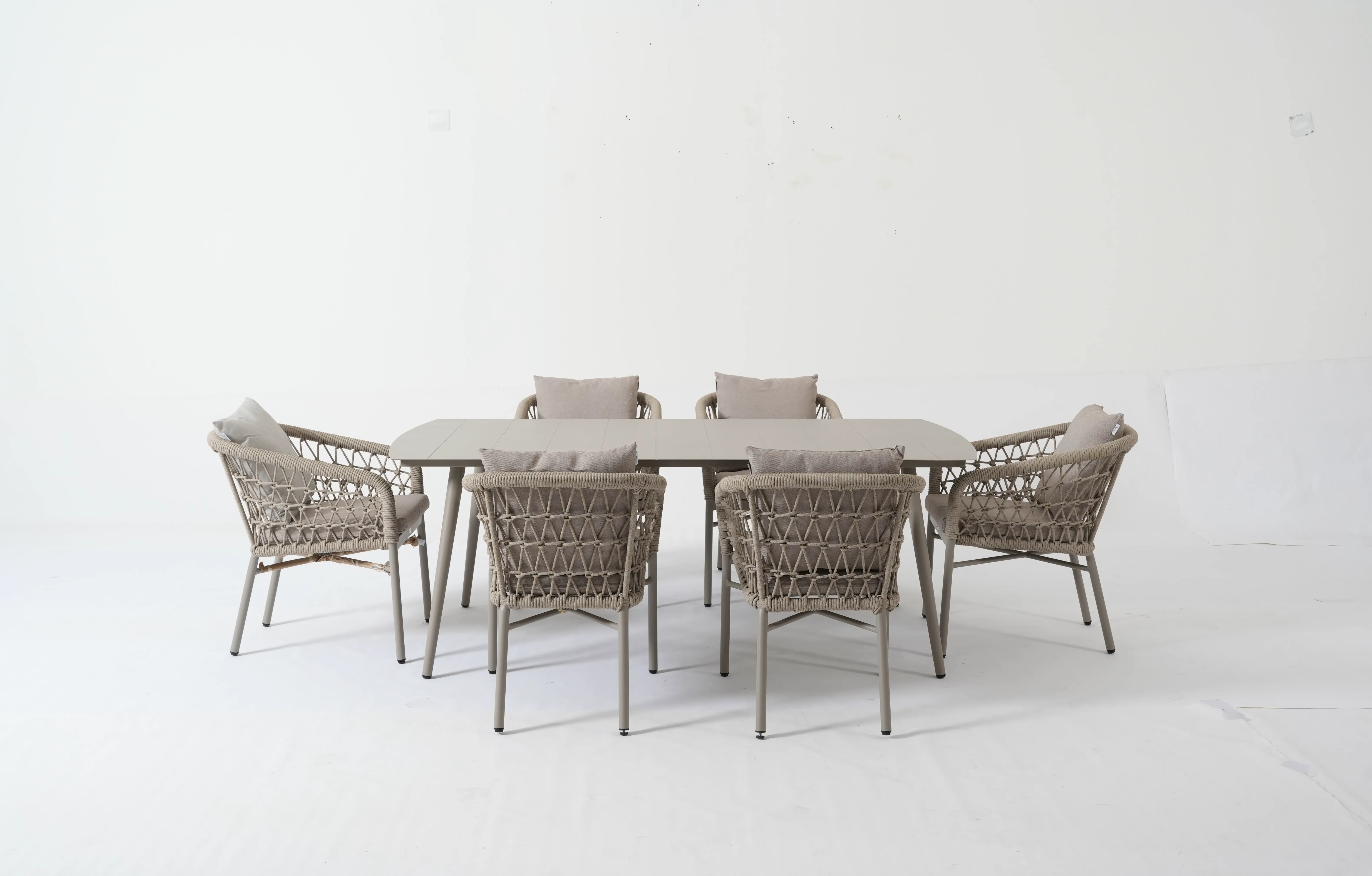 Experience outdoor dining with the sophisticated Michael Town set. This ensemble includes six armchairs made with hand-woven olefin rope and a full-aluminum dining table with a sleek aluminum top, sized 200×100×74 cm.